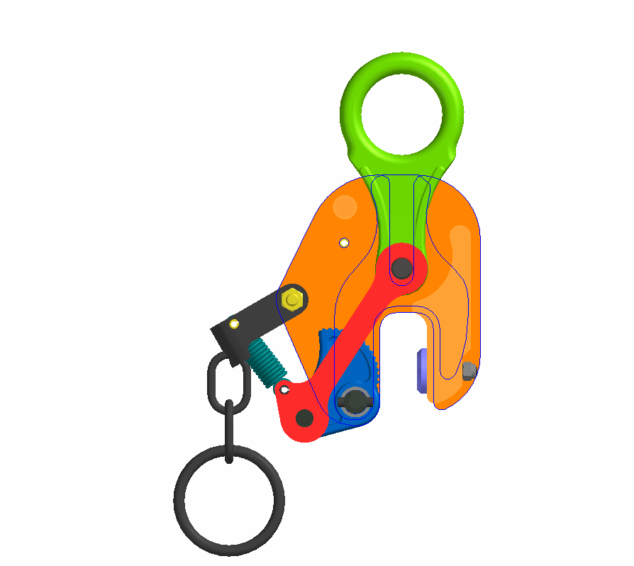 豎吊鋼板鉗在夾持鋼板的時候,鋼板進入鉗口以后,鋼板鉗側面的彈簧鎖緊裝置會將咬齒推動到夾持鋼板的程度,而鋼板鉗的上方吊環也會與鎖緊裝置聯動,吊環越被拉拽,咬齒就會越緊的咬住鐵板。因此,在使用豎吊型鋼板鉗夾持鋼板的時候,鋼板重量越大,吊環被拉拽的力度也會越大,從而使咬齒更強勁的咬合住鐵板。